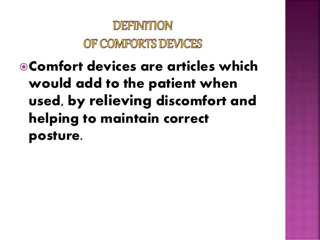 Comfort is define as the contented enjoyment in physical or mental well being freedom from pain or trouble anxiety discomfort is define as want of comfort or ease due to client or annoyance. Comfort devices are the articles which would add to the comfort of the patient when used by relieving discomfort and helping to maintain correct posture. Com fort ed com fort ing com forts 1.